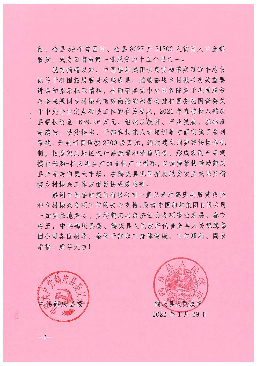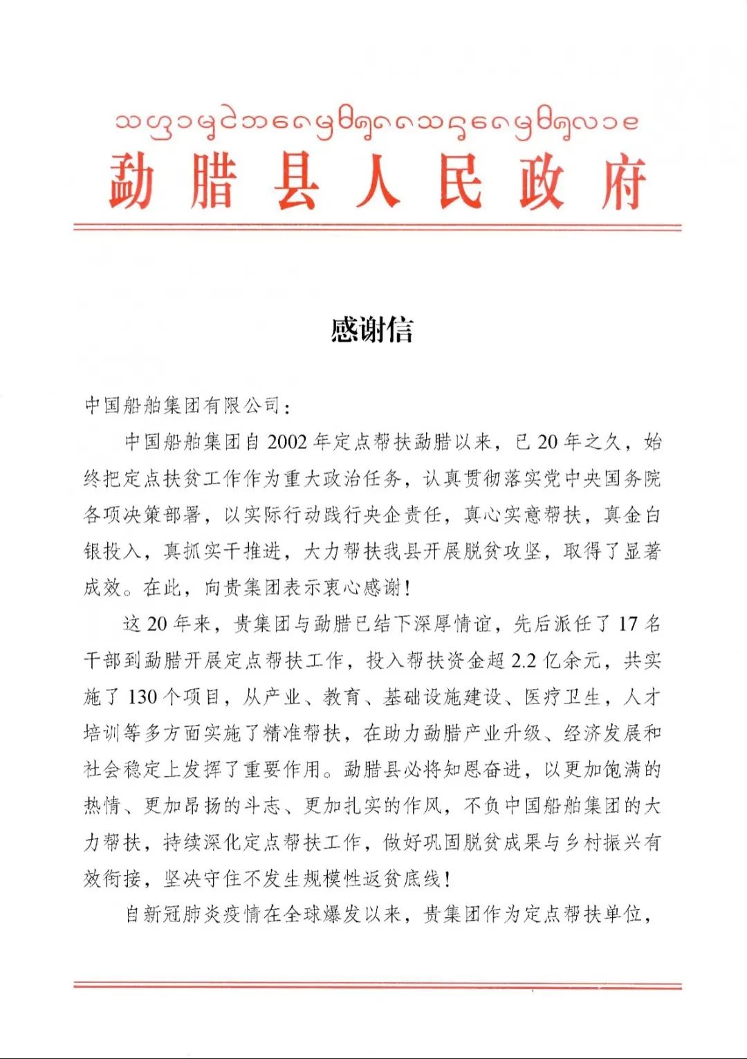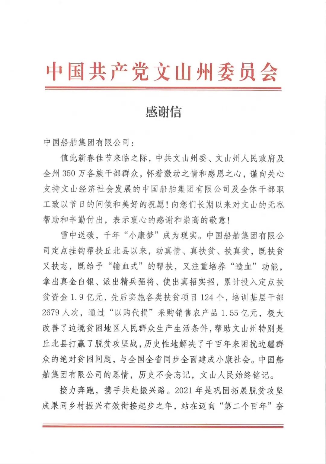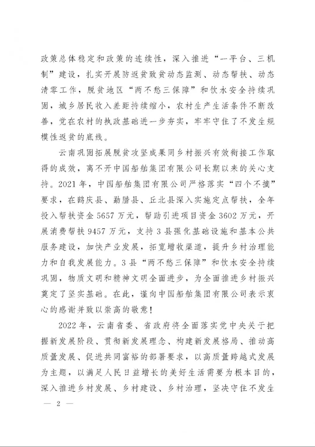 春節(jié)前夕,中國船舶集團(tuán)陸續(xù)收到云南省委省政府、文山州委州政府、鶴慶縣委縣政府、勐臘縣政府發(fā)來的感謝信,對(duì)集團(tuán)公司長(zhǎng)期以來給予鶴慶縣、勐臘縣、丘北縣的傾力幫扶表示衷心感謝和崇高敬意。